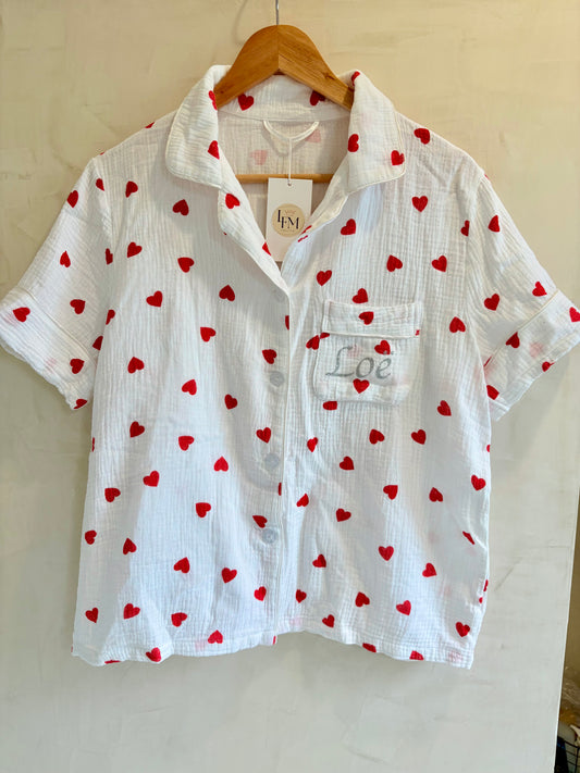 Pyjama femme coton blanc à cœurs rouges – Chemise et short